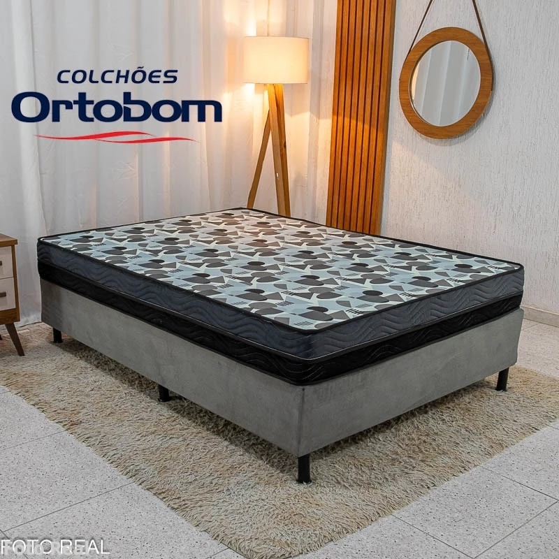 Box Casal Sued Cinza Nosso Sonho + Colchão Casal Ortopédico EPS Iso Dupla Face D-33 138x188x57 – Ortobom | Suporta até 260kg