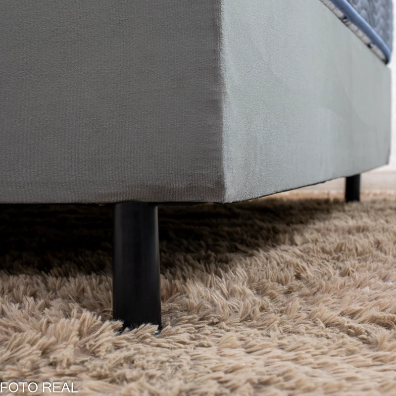 A base box possui estrutura em madeira de eucalipto de reflorestamento, revestimento em suede, pés em PVC com rosca metálica e base antiderrapante. Suporta até 260kg e oferece alta durabilidade e estabilidade.