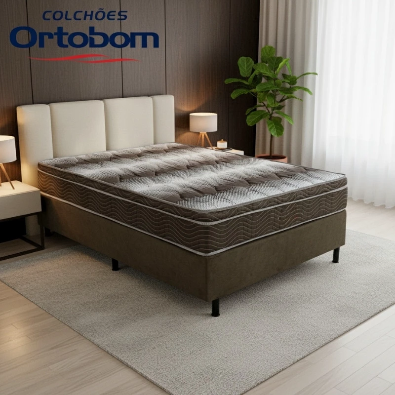Box Casal Sued Marrom Nosso Sonho + Colchão Casal Ortopédico Light 138x188x62 – Ortobom | Suporta até 260kg