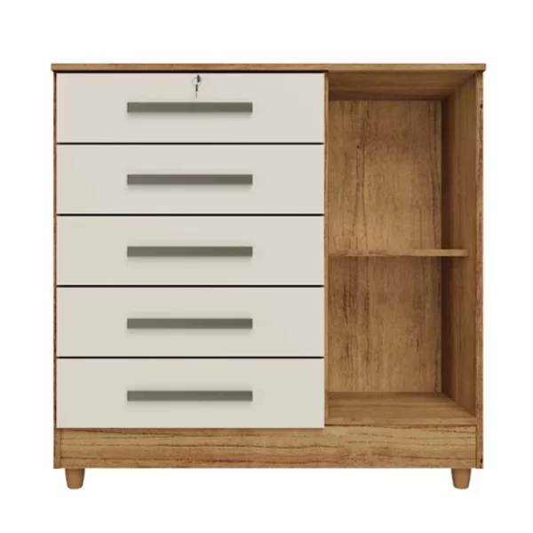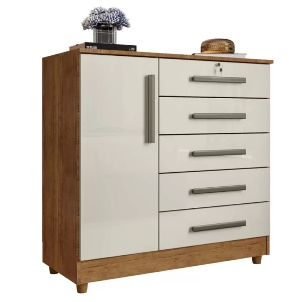 Cômoda Vitória com 5 Gavetas e 1 Porta Mel/Off White Rud Rack