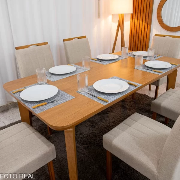 Mesa de Jantar Londrina 180×90 Cinamomo Rufato + 6 Cad. Isabela Linho Bege 01 Madeira – Art Assento
