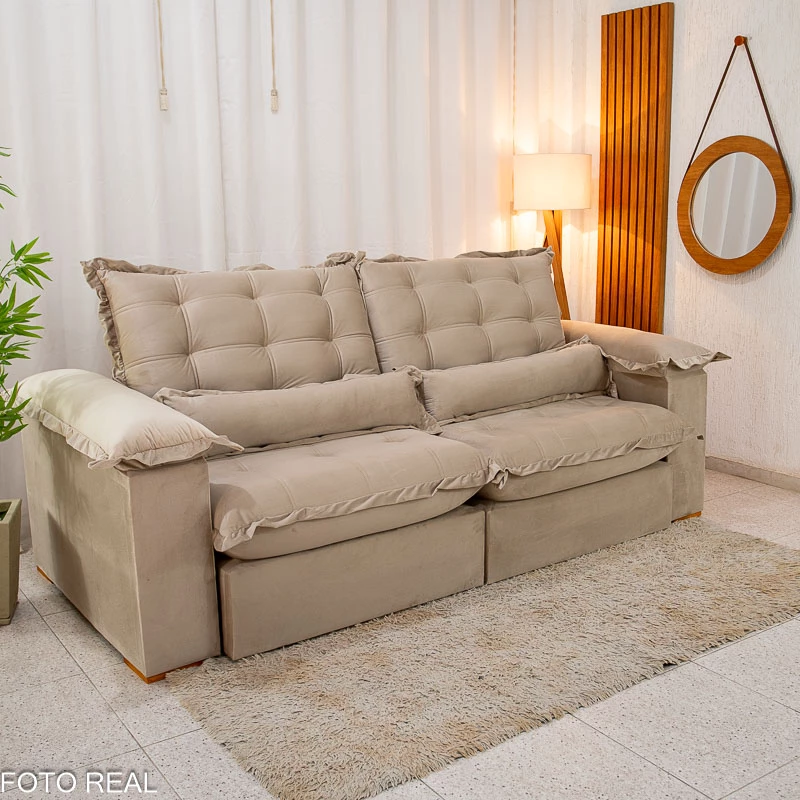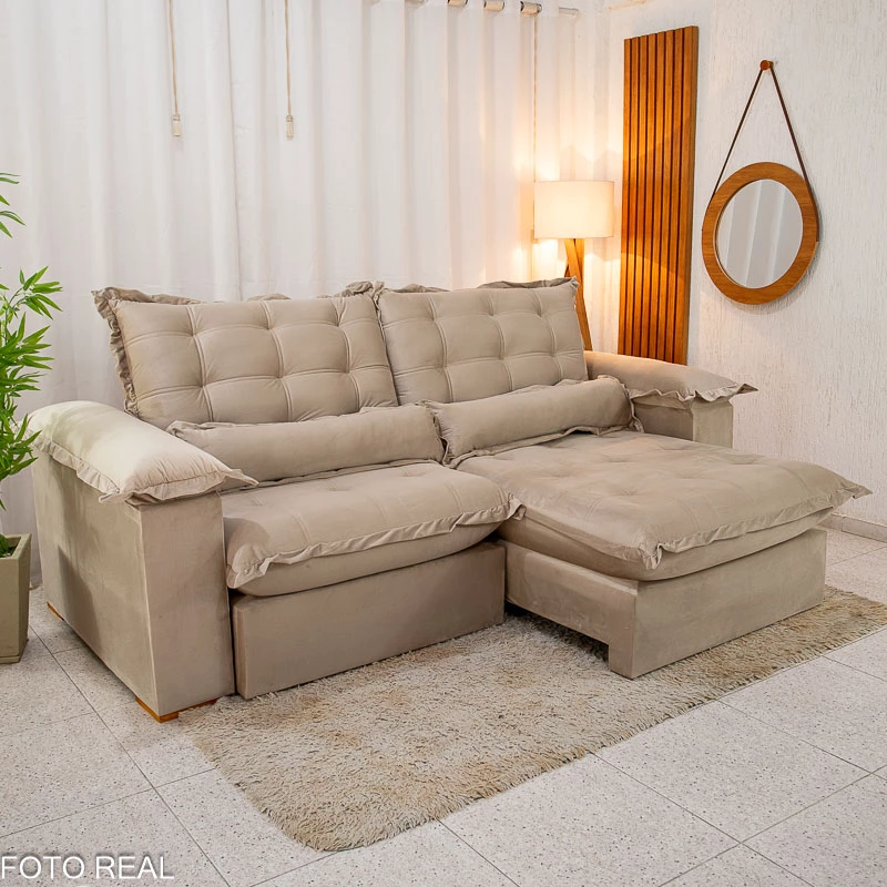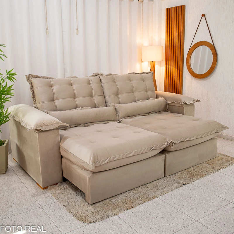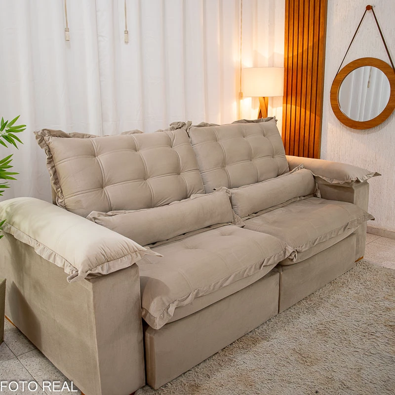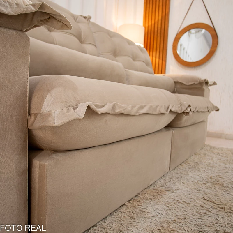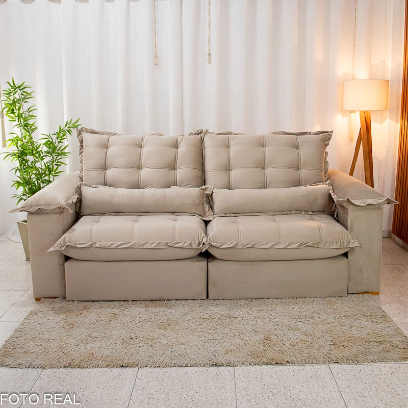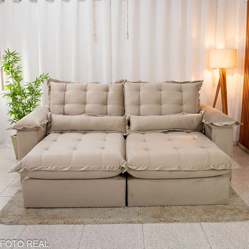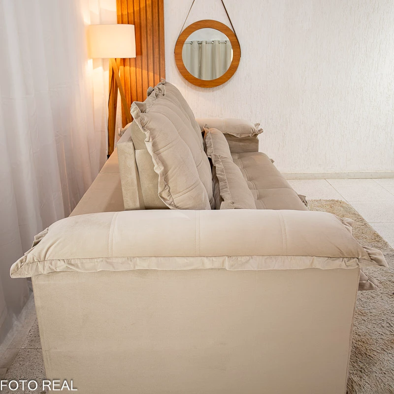 Sofá Retrátil Reclinável Maldivas 2.30m Veludo Bege A32 – Espuma Pró Aditivada
